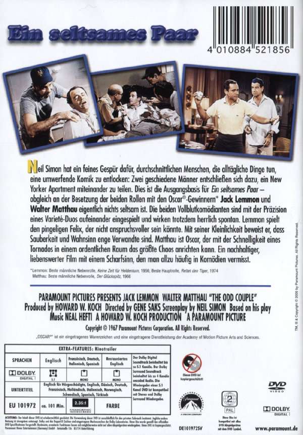 Dos divorciados deciden compartir un apartamento en Nueva York, pero sus caracteres y sus estilos de vida son absolutamente incompatibles. La obsesión por la limpieza y el orden del meticuloso Felix (Lemmon) resulta desesperante para Oscar (Matthau), capaz de desordenar el apartamento a la velocidad del rayo.
