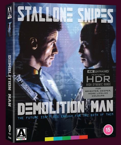 ¡EL FUTURO NO ES LO SUFICIENTEMENTE GRANDE PARA LOS DOS!Sylvester Stallone y Wesley Snipes se enfrentan en este clásico éxito de taquilla de ciencia ficción y acción de Joel Silver, el productor de Die Hard y The Matrix.En 2032, el archicriminal Simon Phoenix (Snipes) despierta de una congelación de 35 años en CryoPrison para encontrar un mundo donde el crimen es casi inexistente, una utopía serena lista para ser tomada. Con la policía ya no equipada para lidiar con su brutalidad al estilo de los 90, reviven al sargento John Spartan (Stallone), el oficial de policía sin restricciones condenado injustamente a CryoPrison que originalmente derribó a Phoenix. ¿Un policía de la vieja escuela contra un criminal de la vieja escuela, ajustando cuentas en las calles de San Ángeles? El futuro no sabrá lo que le ha golpeado.Con un guión coescrito por Daniel Waters (Heathers, Batman Returns) y un elenco secundario que incluye a Denis Leary, Benjamin Bratt y Sandra Bullock en su papel revelación, Demolition Man es una increíble mezcla de acción y humor.CONTENIDO DE EDICIÓN LIMITADA 4K ULTRA HD:- Nueva restauración 4K a partir del negativo original de la cámara de 35 mm de Arrow Films, aprobado por el director Marco Brambilla.- Incluye las versiones nacionales de "Taco Bell" e internacionales de "Pizza Hut" de la película presentadas a través de ramificaciones sin interrupciones.- Presentación 4K Ultra HD (2160p) en Dolby Vision (compatible con HDR10).- Opciones de audio originales DTS-HD MA 5.1 y Dolby Atmos sin pérdidas.- Subtítulos opcionales en inglés para personas sordas e hipoacúsicas.- Nuevos comentarios de audio del director Marco Brambilla y el guionista Daniel Waters.- Nuevo comentario de audio del historiador de cine Mike White del podcast Projection Booth.- Comentario de audio de archivo por Marco Brambilla y el productor Joel Silver.- Demolition Design, una nueva entrevista con el diseñador de producción David L. Snyder.- Cryo Action, una nueva entrevista con el coor