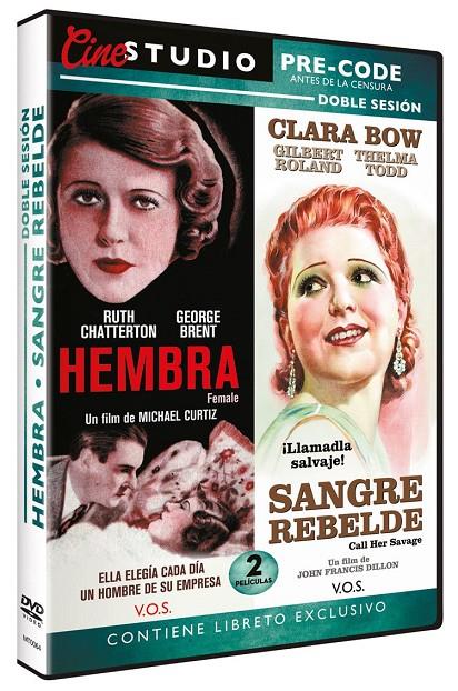 Esta esple´ndida doble sesio´n recoge dos de los personajes femeninos ma´s escandalosos de todo el cine pre-code: el de la mujer independiente que aprovecha su poder econo´mico para tratar a los hombres como objetos sexuales, y el de la mestiza cuya pasio´n desmedida la llevara´ a una vida salvaje de sexo y alcohol. Ruth Chatterton y Clara Bow (en una de sus pocas incursiones en el cine hablado) son las heroi´nas de estos dos cla´sicos absolutos del ge´nero.HEMBRA (Female) (Michael Curtiz, 1933): Alison (Ruth Chatterton) es duen~a de una fa´brica de automo´viles. Dura y agresiva, ha de luchar en un mundo de hombres, pero no se achanta. Su secreto es tratar al macho como ellos lo hacen con las hembras. De este modo, Alison elige cada noche al atractivo empleado que se le antoja y se lo lleva a casa para "hablar de negocios". Comienza entonces su ritual de depredacio´n sexual.SANGRE REBELDE (Call Her Savage) (John Francis Dillon, 1932): Nasa (Clara Bow) es una mestiza con sangre blanca e india. Rebelde e indomable, no respetara´ las tradiciones de su padre y huira´ con un hombre que no la conviene, quedando embarazada. Como si de una maldicio´n se tratase, la vida de Nasa ira´ degrada´ndose irremediablemente hacia el vicio, el alcohol y la prostitucio´n.