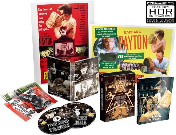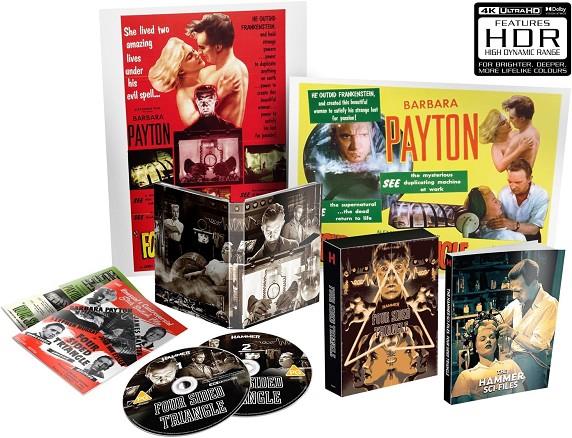 La longeva estrella de Hollywood Barbara Payton interpreta a una mujer duplicada a través de la tecnología en este cuento con moraleja que mezcla el horror de Home Counties con la ciencia ficción profética (la primera de Hammer). Coprotagonizada por Stephen Murray como el científico desequilibrado y dirigida por la leyenda de la Hammer Terence Fisher, Four Sided Triangle se presenta aquí como una nueva restauración 4K de elementos originales de la película en su relación de aspecto teatral original.Lena regresa a su casa después de muchos años para descubrir que sus dos amigos de la infancia, Bill y Robin, ahora son científicos y han creado una máquina que puede duplicar objetos perfectamente. El corazón de Bill se rompe cuando se da cuenta de que Lena ama a Robin, hasta que se le ocurre la loca idea de duplicar a Lena en su máquina.EXTRAS:-Comentario de Melanie Williams y Thirza Wakefield, con comentarios de Kevin Lyons y Jonathan Rigby.Trailer.-Terence Fisher featurette.-No me avergüenzo.-Galería de imágenes